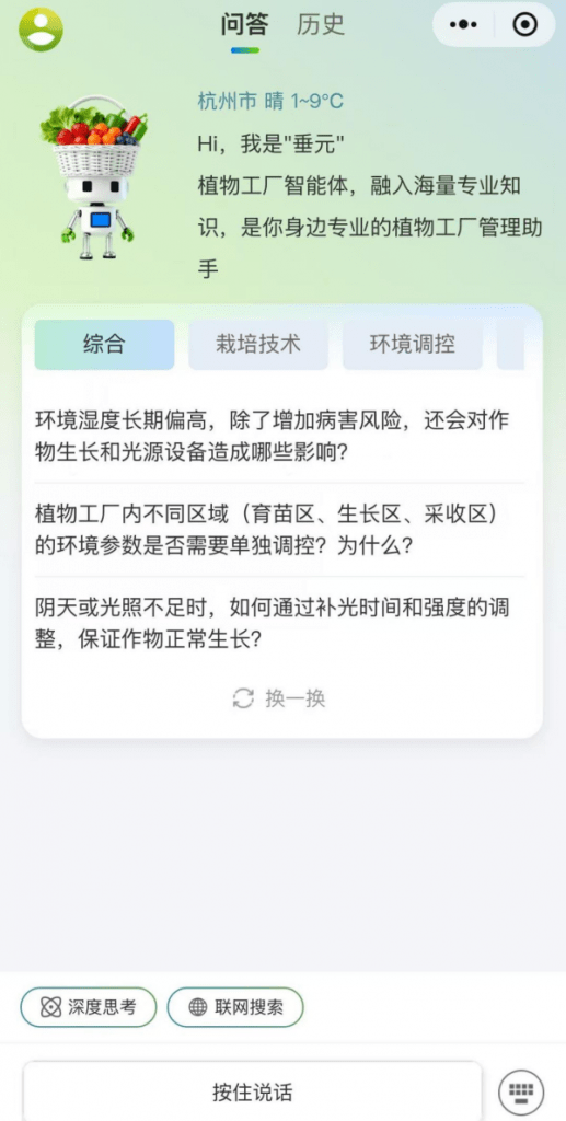 精准种植是提升作物产量与品质的核心抓手。“垂元”依托多品类作物生长模型数据库,通过人工智能算法,优化光、温、水、气、肥全要素调控参数,输出定制化种植管理方案,实现作物全生育期标准化管控,推动种植模式从传统经验驱动向数据智能驱动跨越。在一线运维场景中,面对系统运行异常等技术难题,该智能体可快速定位故障根源,输出结构化解决方案,大幅降低运维技术门槛,最大限度缩减生产损失。
