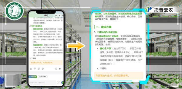 作为面向植物工厂全生命周期运维的智能助手,“垂元”深度整合二十年的数据积累,形成超千万字专题知识库,涵盖植物工厂技术迭代、工程实践与栽培模型等全维度专业信息,具备种植参数智能推荐、建设方案生成、系统异常排查建议等功能,成功将分散的行业经验转化为可直接调用的知识引擎,实现从科研规划到建设运营的全流程智能赋能。