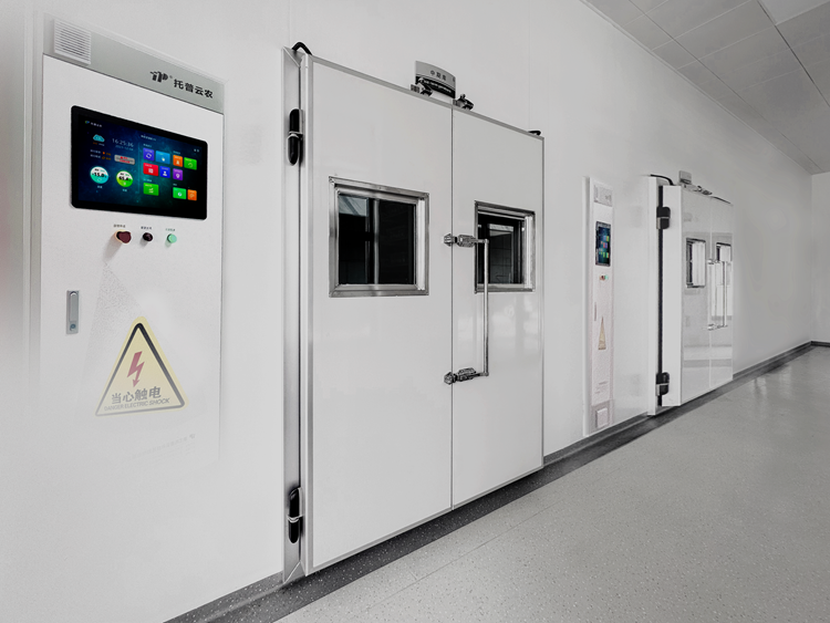库房内侧上方装有吊顶式冷风机和匀流送风板,进门有风幕保温隔离系统。